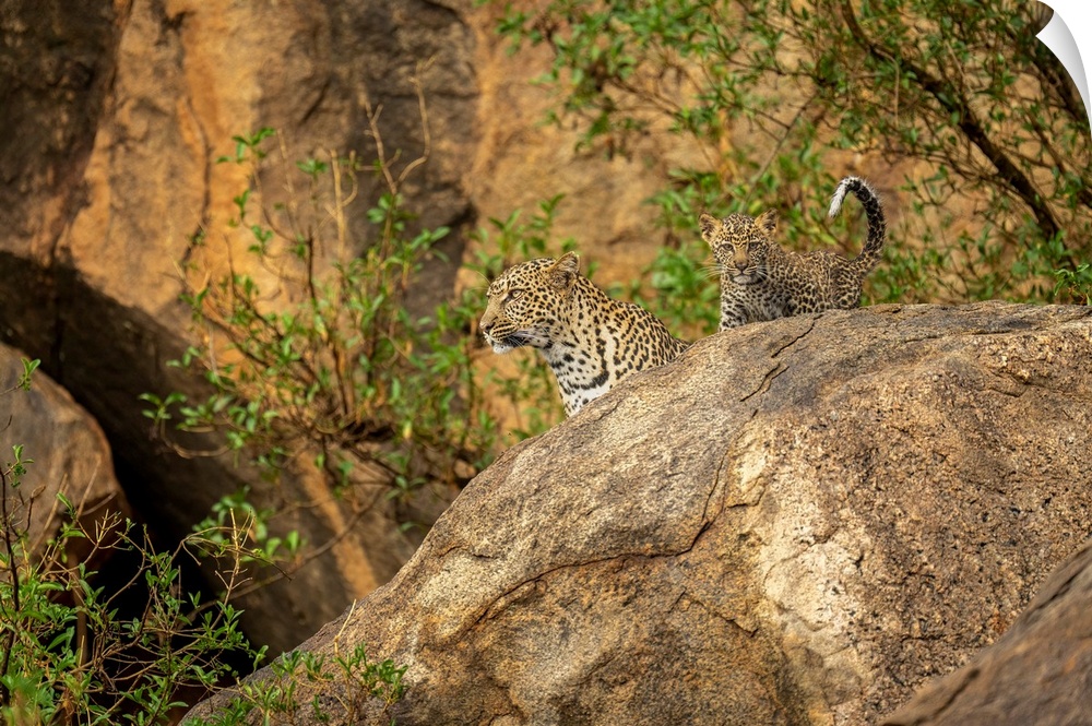 <p>Leopard and cub (Panthera pardus) look out from rock; Kenya</p>