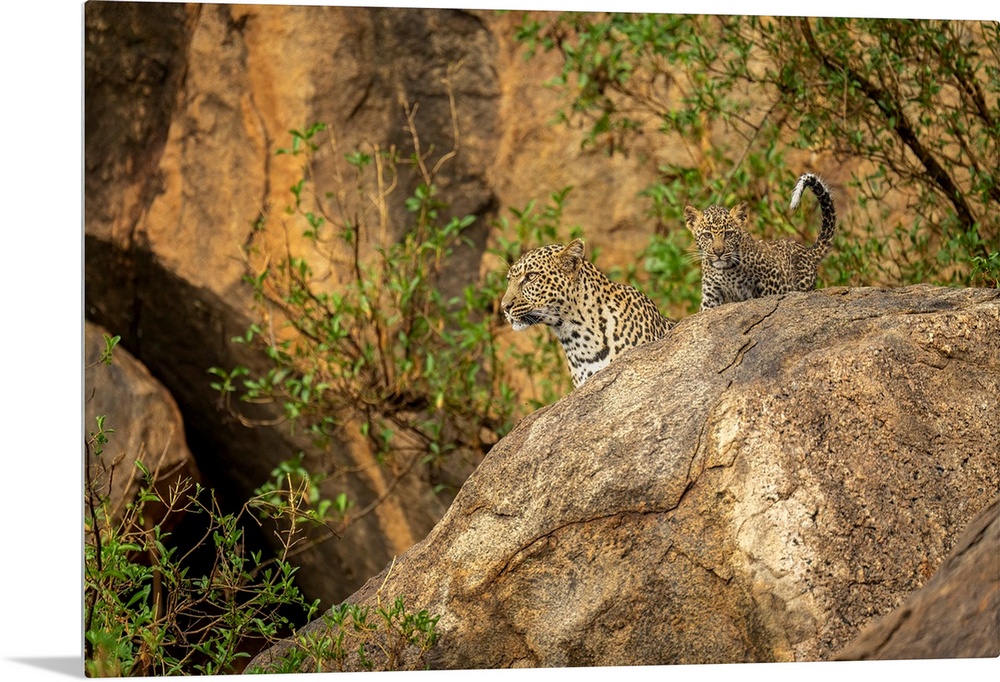<p>Leopard and cub (Panthera pardus) look out from rock; Kenya</p>