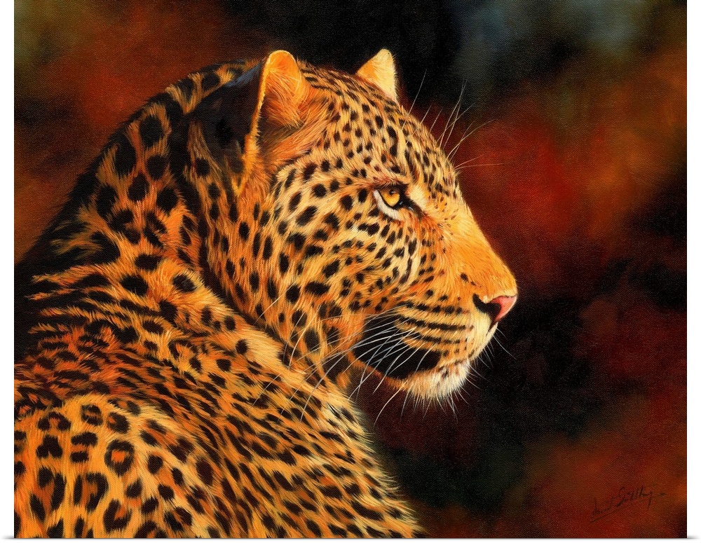 <p>Contemporary painting of a leopard illuminated in a warm light.</p>