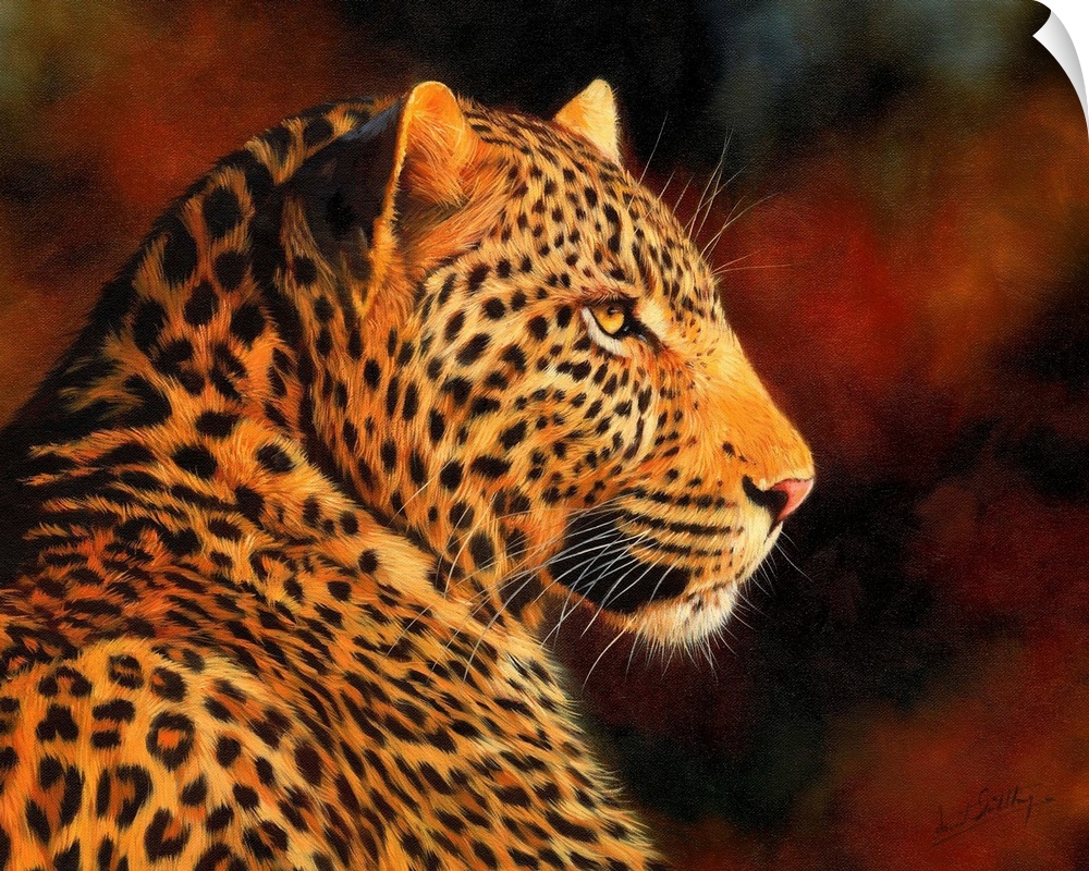 <p>Contemporary painting of a leopard illuminated in a warm light.</p>