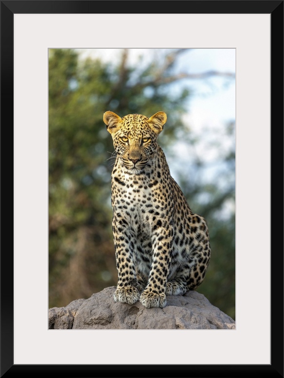 <p>Leopard cub sitting on a termite mound, Kalahari Desert, Botswana</p>