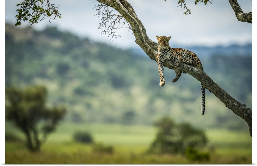 <p>Leopard (Panthera pardus) lies on diagonal branch facing camera, Klein's Camp, Serengeti National Park; Tanzania</p>