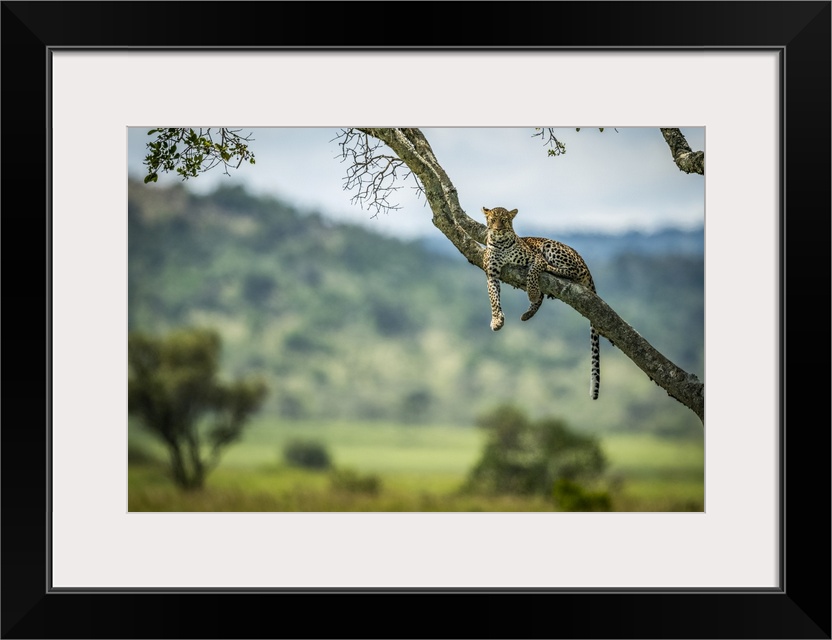 <p>Leopard (Panthera pardus) lies on diagonal branch facing camera, Klein's Camp, Serengeti National Park; Tanzania</p>