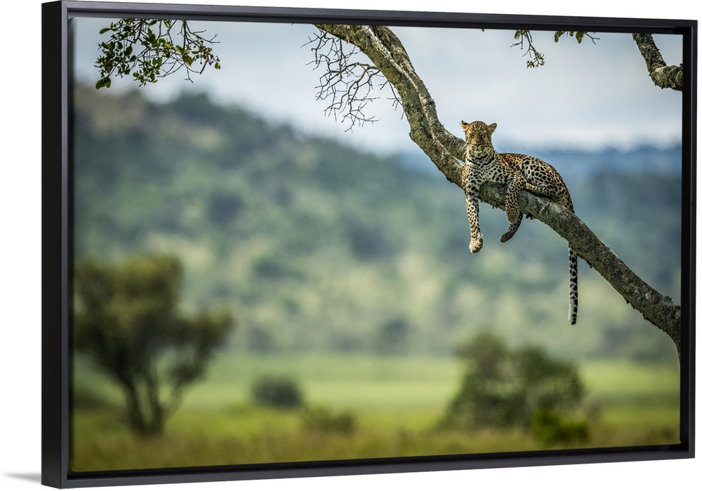 <p>Leopard (Panthera pardus) lies on diagonal branch facing camera, Klein's Camp, Serengeti National Park; Tanzania</p>