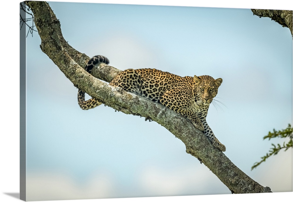 <p>Leopard (Panthera pardus) lies on diagonal branch looking down, Klein's Camp, Serengeti National Park; Tanzania</p>