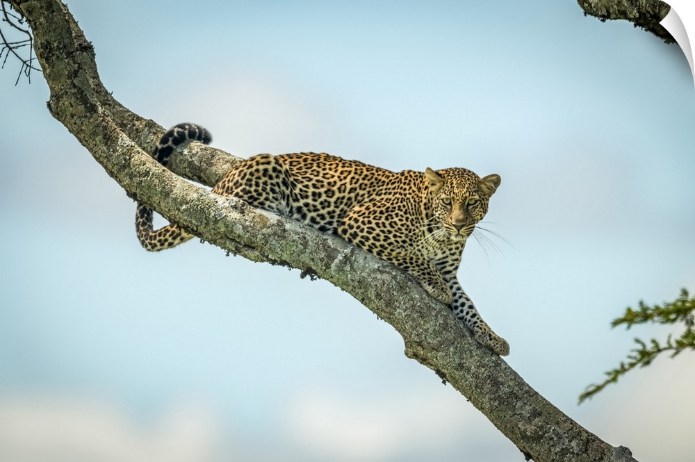 <p>Leopard (Panthera pardus) lies on diagonal branch looking down, Klein's Camp, Serengeti National Park; Tanzania</p>