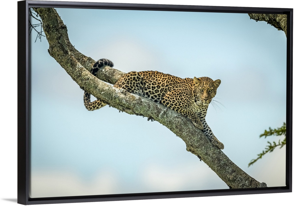 <p>Leopard (Panthera pardus) lies on diagonal branch looking down, Klein's Camp, Serengeti National Park; Tanzania</p>