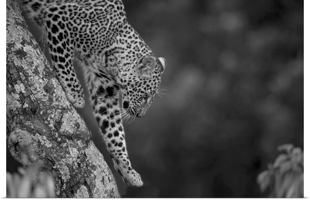 <p>Close-up of a leopard (panthera pardus) lifting its paw walking down a branch at the Kicheche bush camp, Masai mara, Kenya.</p>