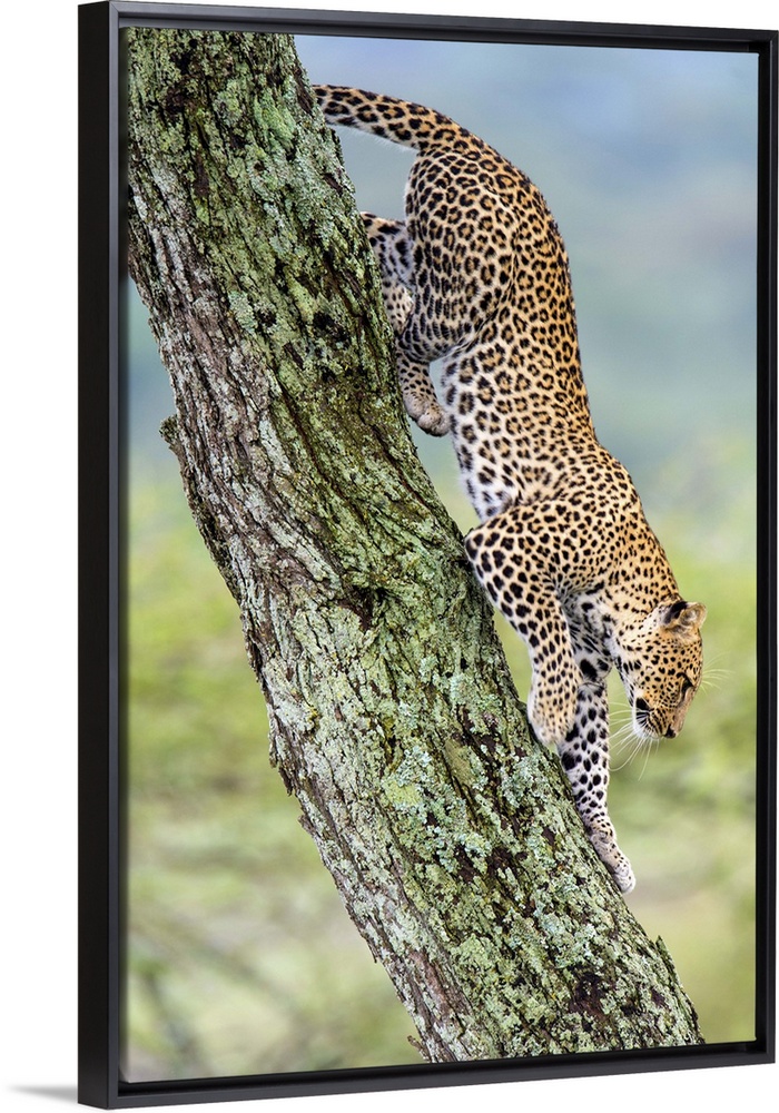 <p>Leopard (Panthera pardus) moving down a tree, Ndutu, Ngorongoro Conservation Area, Tanzania</p>