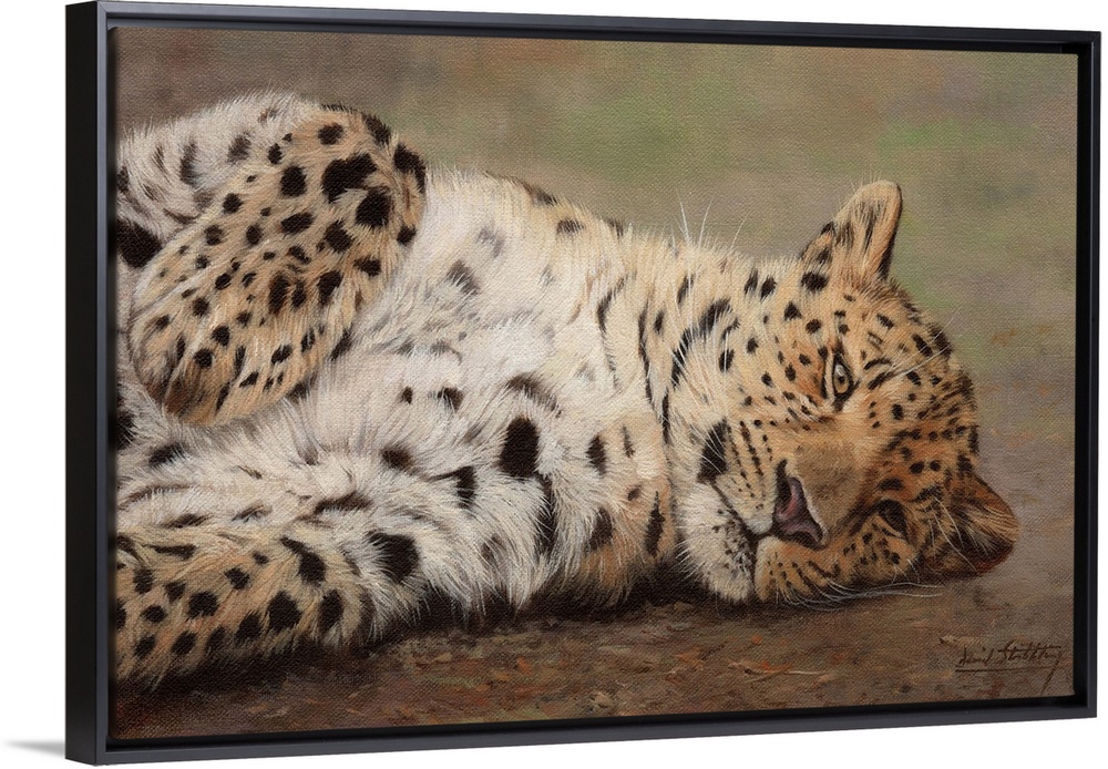 <p>Contemporary painting of a leopard resting playfully on the ground.</p>
