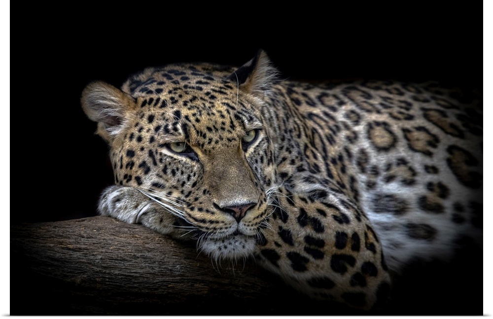 <p>A leopard (Panthera pardus) rest in a tree with black background.</p>