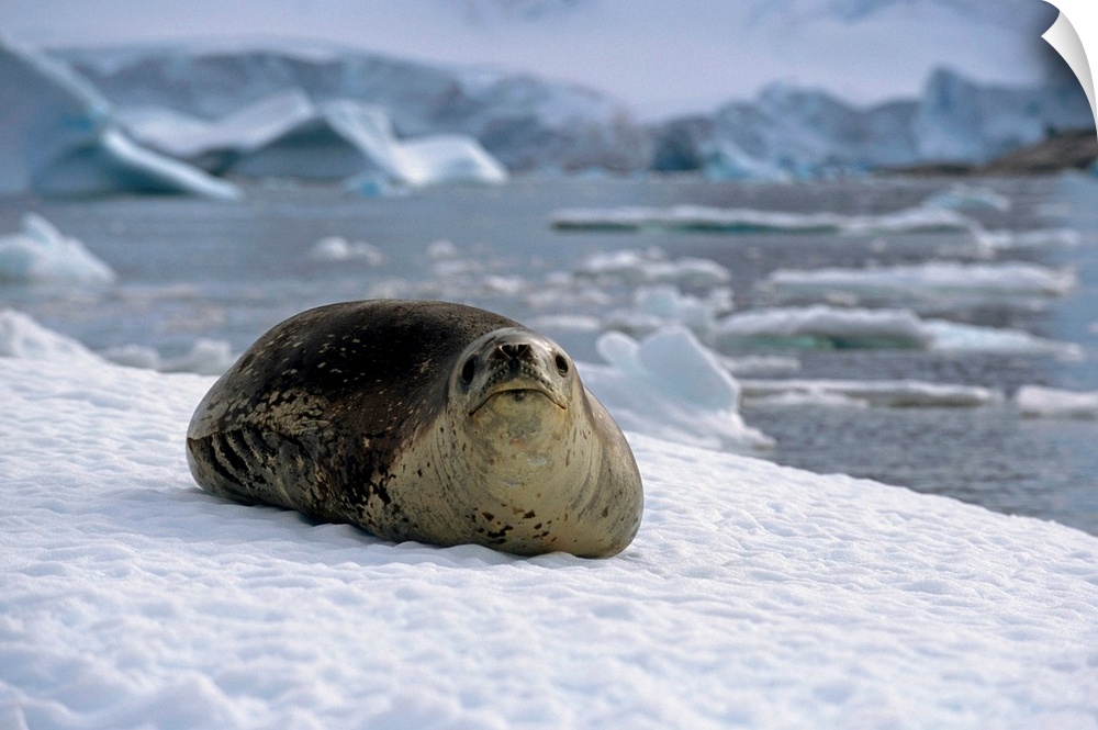 <p>Leopard seal laying on ice pack, antarctica, summer.</p>