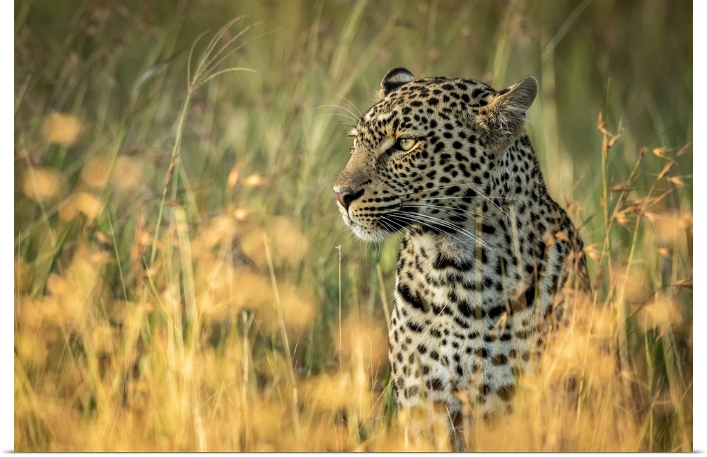 <p>Close-up of leopard (Panthera pardus) sitting in long grass, Grumeti Serengeti Tented Camp, Serengeti National Park; Tanzania</p>