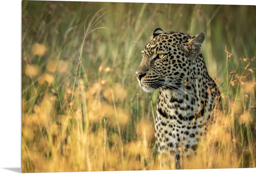 <p>Close-up of leopard (Panthera pardus) sitting in long grass, Grumeti Serengeti Tented Camp, Serengeti National Park; Tanzania</p>