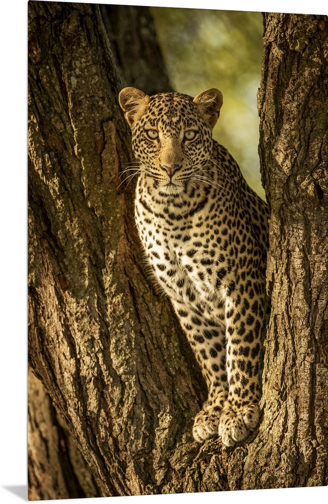 <p>A leopard (Panthera pardus) sits in the forked trunk of a tree. It has a brown, spotted coat and is looking straight at the camera, Serengeti National Park; Tanzania</p>