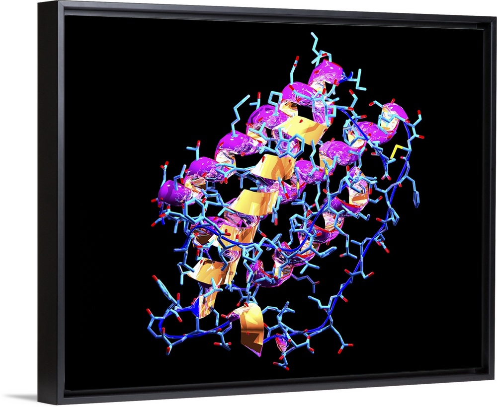 <p>Leptin molecule. Computer model of a molecule of leptin, a protein produced by white fat cells in adipose tissue. Leptin controls the amount of white adipose tissue that is laid down in the body, and acts on the brain as a signal to regulate appetite. Mutations in the ob gene that codes for leptin are thought to be responsible for some forms of obesity.</p>