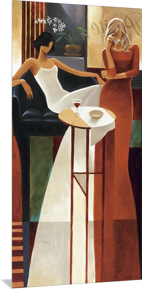 <p>Contemporary painting of two women in evening gowns with wine.</p>