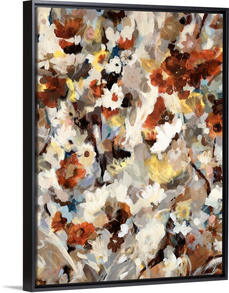 <p>Vertical, contemporary painting on large canvas of many small flowers in warm and neutral tones, swirling amongst leaf like brushstrokes.</p>