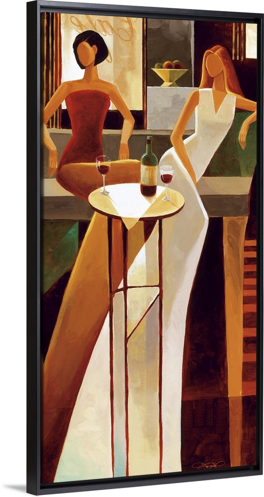 <p>Contemporary painting of two women in evening gowns with wine.</p>