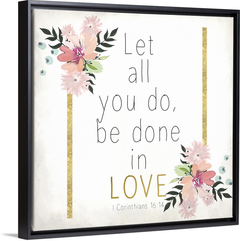 <p>Bible verse 1 Corinthians 16:14 with gold stripes and pink flowers.</p>
