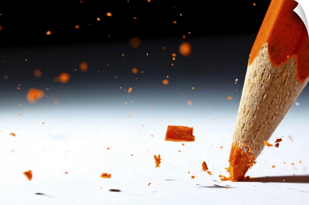 <p>Close up image of the lead of an orange colored pencil shattering.</p>