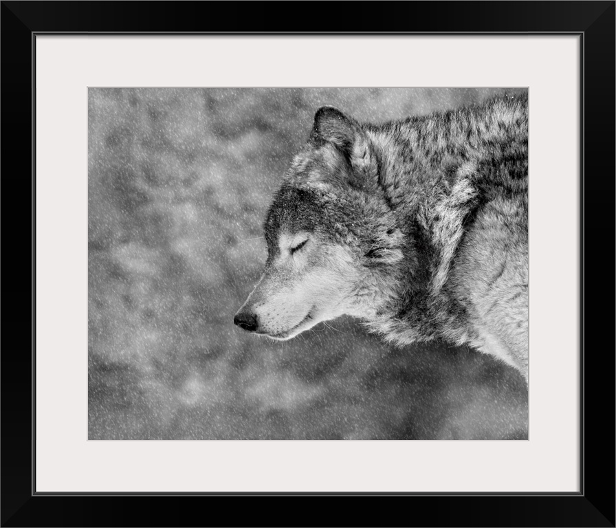 <p>A wolf with its eyes closed enjoying the heavy snowfall.</p>