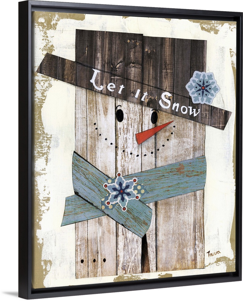<p>A decorative winter painting of a snowman made out of wood that says ?Let it Snow? on its top hat.</p>