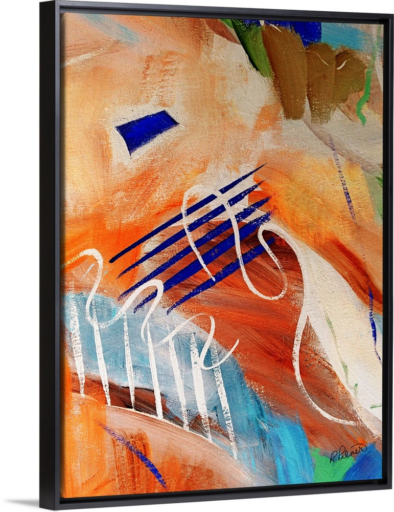 <p>Abstract painting with a bright background and royal blue and white lined designs on top that stand out.</p>
