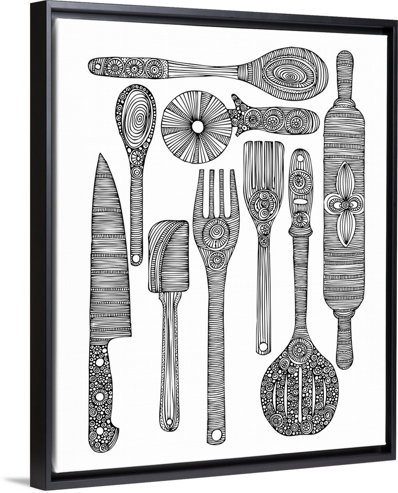 <p>Contemporary line art of ornately patterned cookware against a white background.</p>