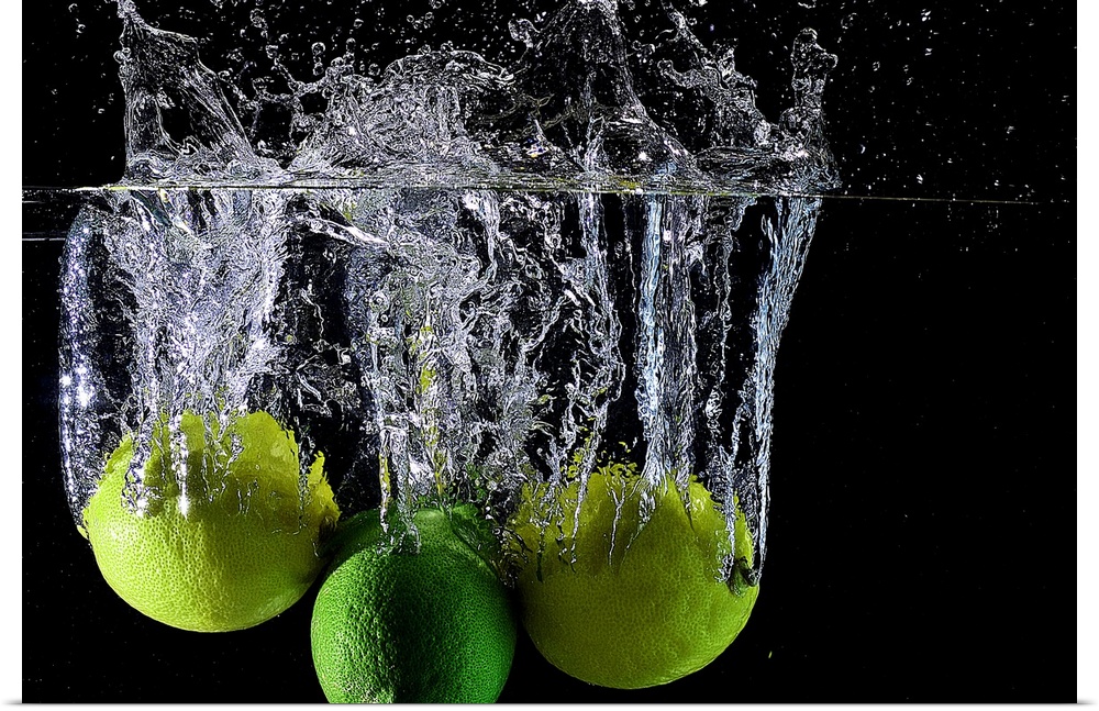 <p>Lemons and limes splashing into clear water.</p>