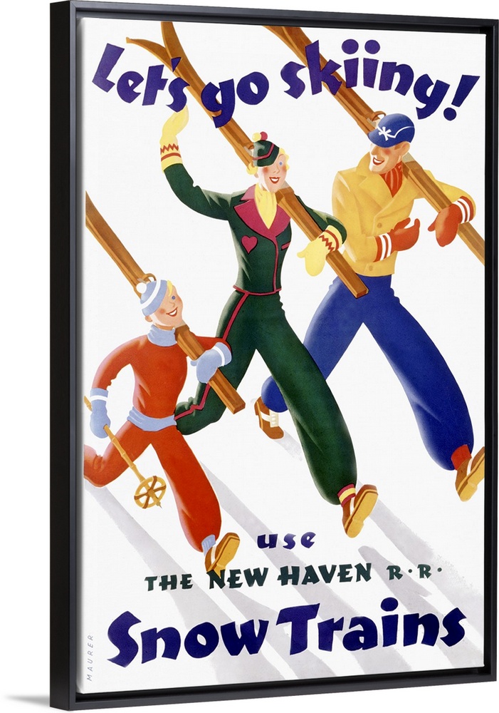 <p>Big, vertical vintage advertisement for the New Haven R.R. Snow Trains. Three people walk down a snowy slope with skis in hand, text above them exclaims "Let's go skiing!".</p>