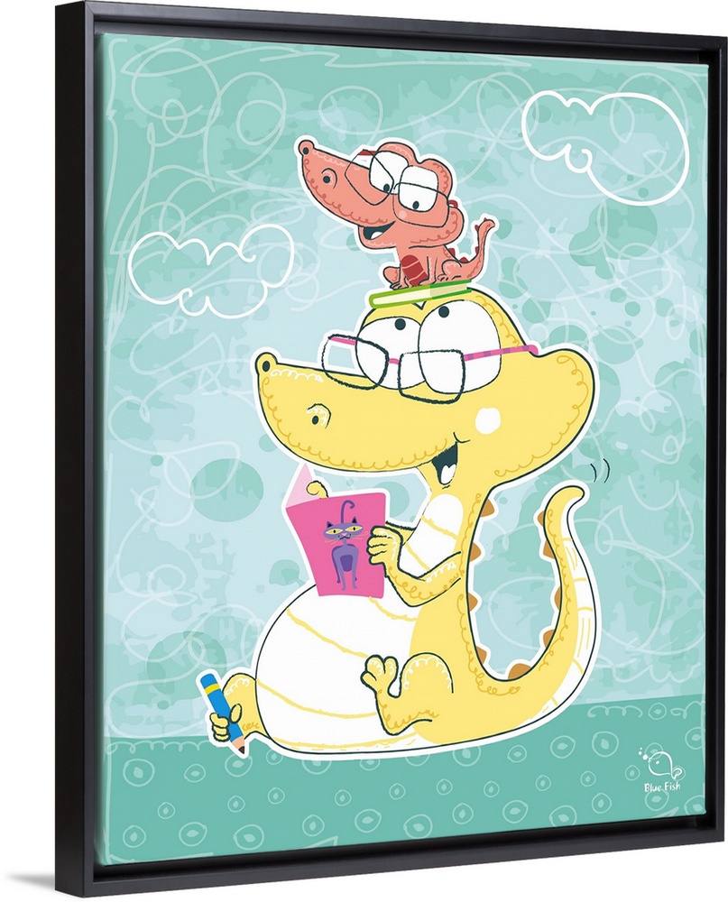 <p>Cute illustration of a baby alligator and an older alligator wearing glasses and reading a book together.</p>