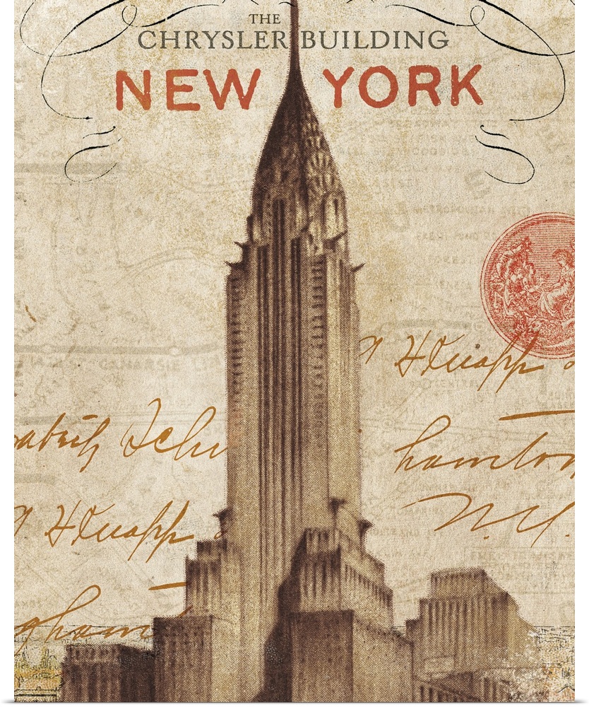 <p>Vertical, oversized wall hanging of a vintage letter from New York with script, handwritten text around an image of the Chrysler Building.</p>