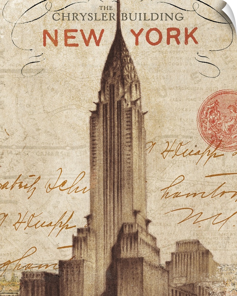 <p>Vertical, oversized wall hanging of a vintage letter from New York with script, handwritten text around an image of the Chrysler Building.</p>
