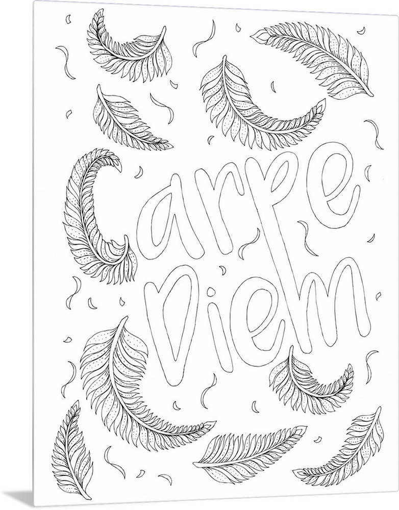 <p>Black and white line art with the phrase "Carpe Diem" surrounded by feathers.</p>