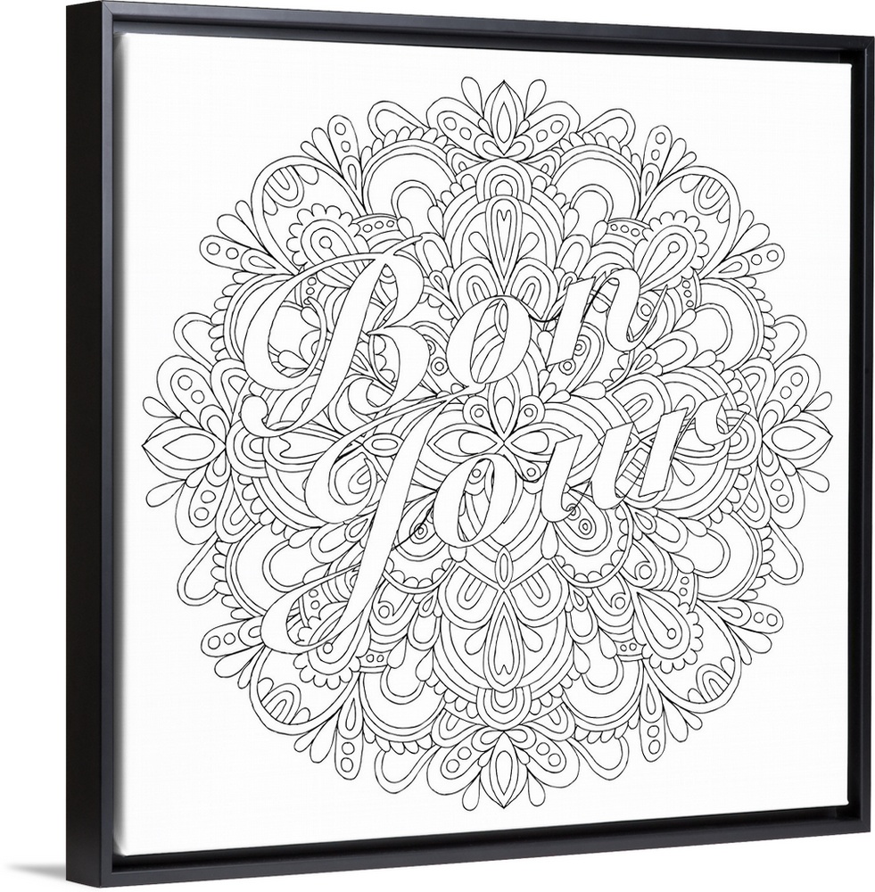 <p>Black and white line art with the phrase "Bon Jour" written over a round floral design.</p>