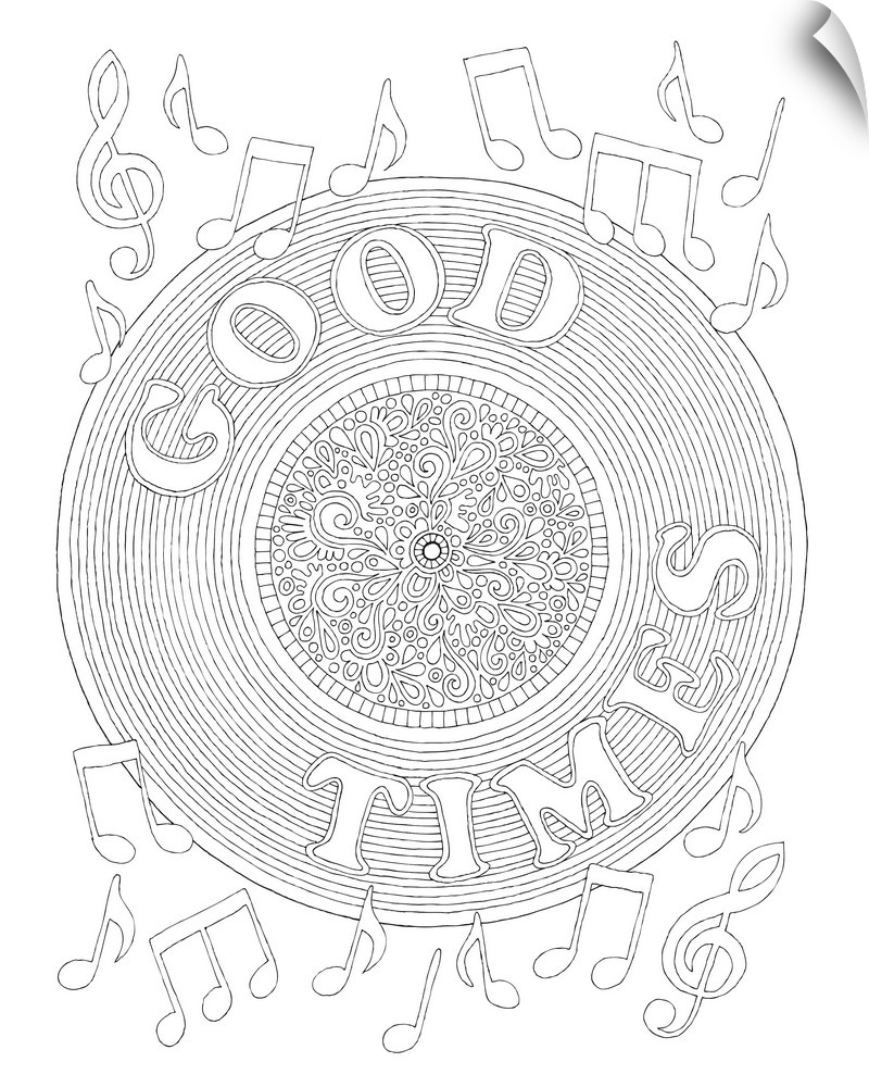 <p>Black and white line art with a vinyl record and the phrase "Good Times" written on top and surrounded by music notes.</p>