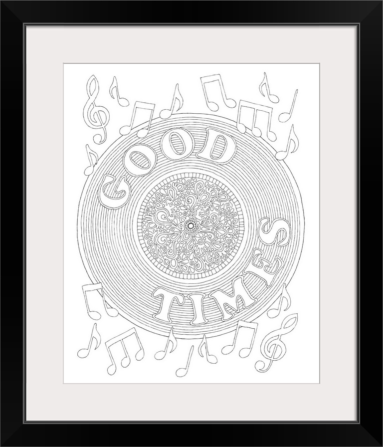 <p>Black and white line art with a vinyl record and the phrase "Good Times" written on top and surrounded by music notes.</p>