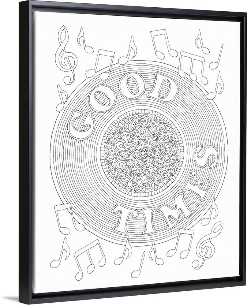 <p>Black and white line art with a vinyl record and the phrase "Good Times" written on top and surrounded by music notes.</p>