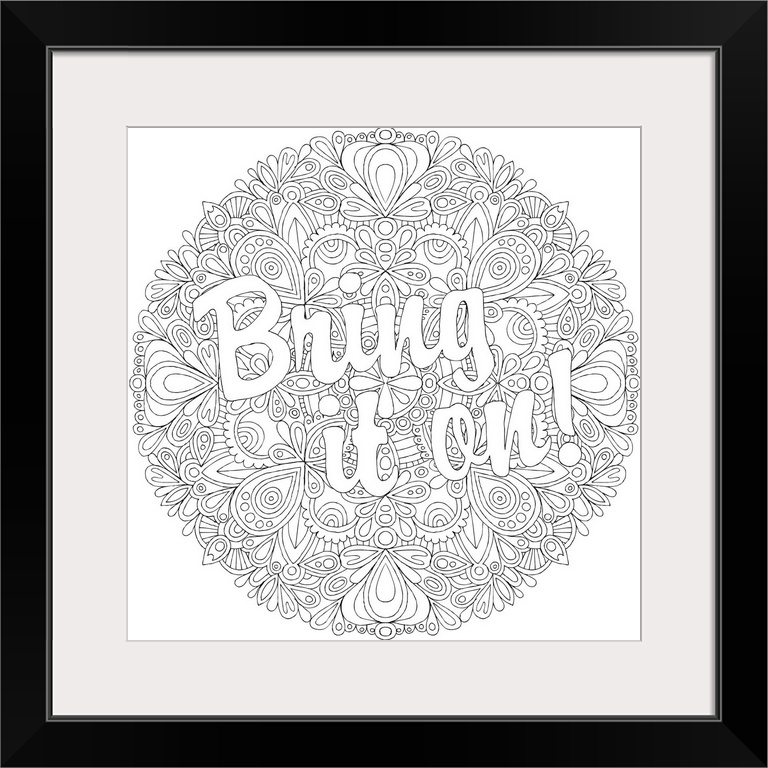 <p>Black and white line art with the phrase "Bring it on!" written on top of a circular floral design.</p>