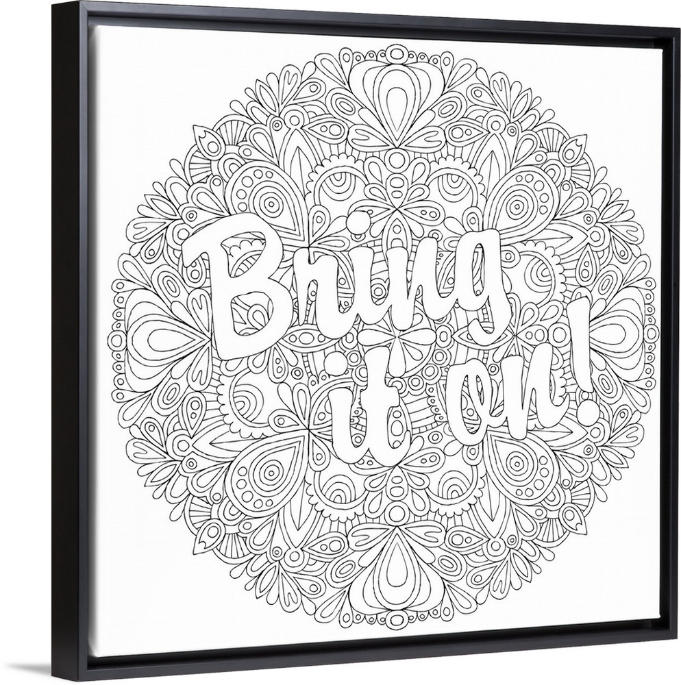 <p>Black and white line art with the phrase "Bring it on!" written on top of a circular floral design.</p>