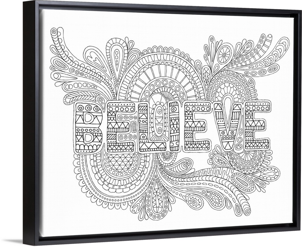 <p>Black and white line art with the word "Believe" made out of a patterned design and an intricately detailed design surrounding it.</p>