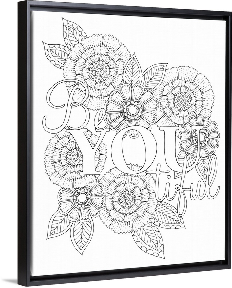 <p>Black and white line art with the phrase "Be you tiful" written on a floral background.</p>