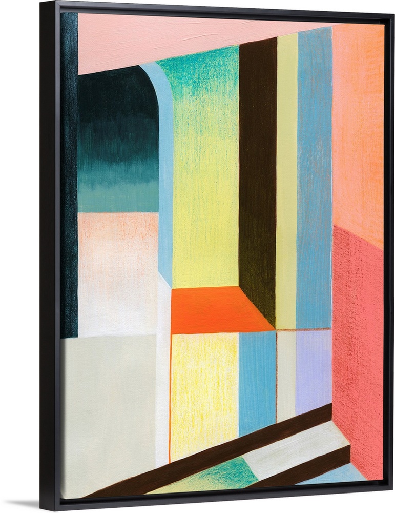 <p>A brightly colored geometric abstract piece featuring an archway and block shapes that appear to be spects and alcoves</p>