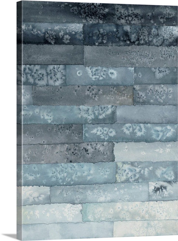 <p>Abstract watercolor art featuring a textured, staggered block pattern in cool blues and grays with organic salt effects, evoking a serene, modern aesthetic.</p>