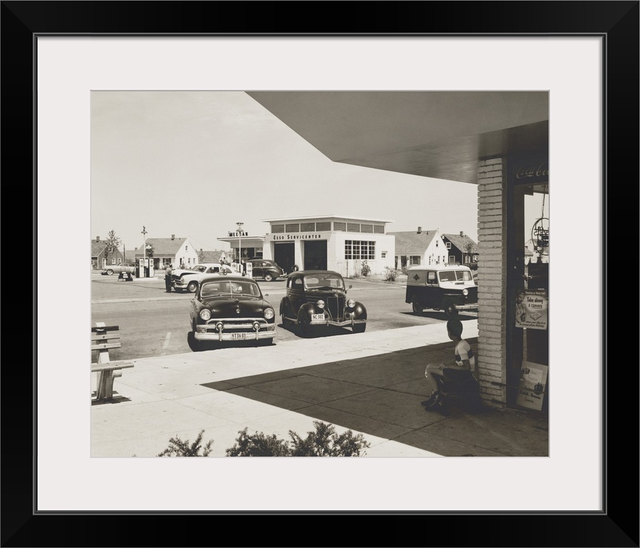 <p>Levittown, N.Y. corner store across the street from a gas station. It was the first mass-produced suburb and had common public amenities such as community centers and stores. Aug. 21, 1952.</p>