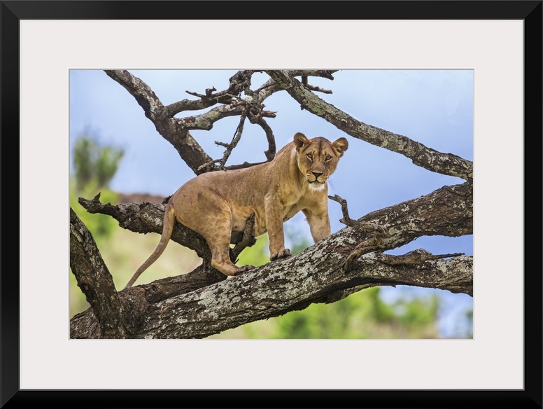 <p>Kenya, Meru County, Lewa Wildlife Conservancy. A Lioness eyeing her potential prey from a vantage point on a dead tree.</p>