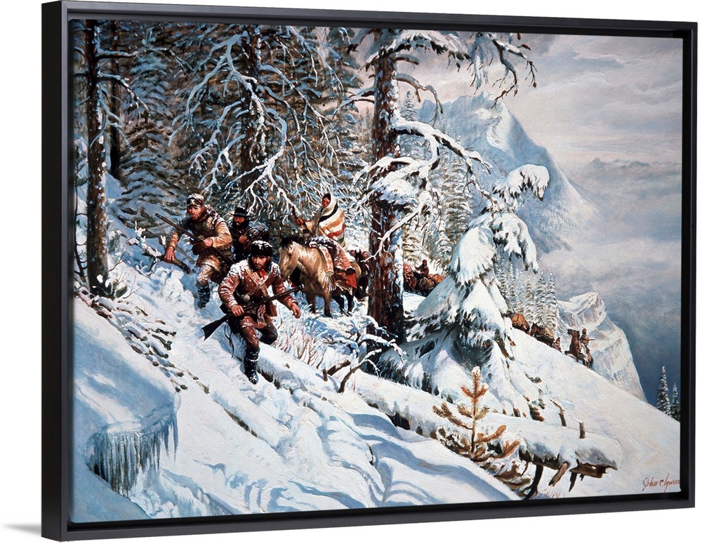 <p>Lewis and Clark, with their guide Sacagawea (on horseback), in the Bitterroot Mountains in present-day Idaho, September 1805. Oil on canvas, 1967, by John Clymer.</p>