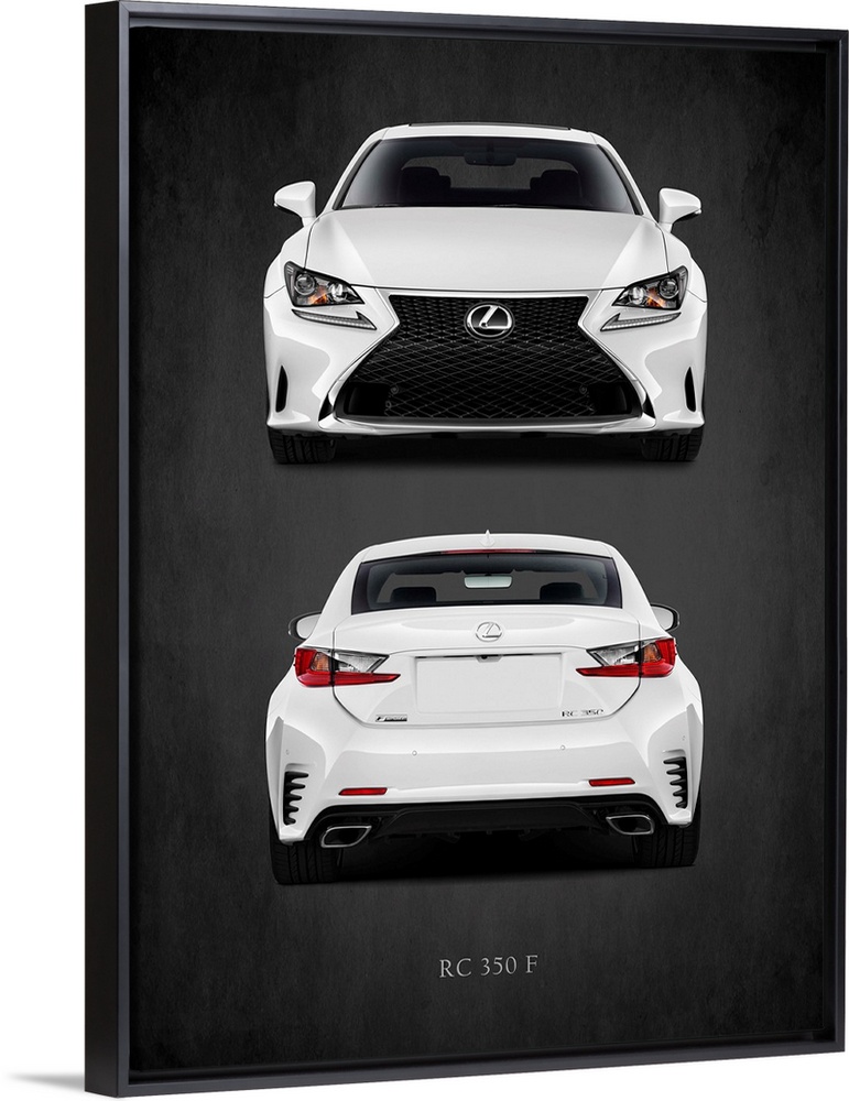 <p>Photograph of the front and the back of a white Lexus RC 350 F printed on a black background with a dark vignette.</p>
