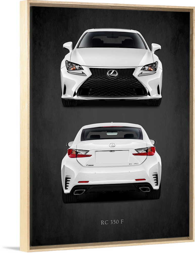 <p>Photograph of the front and the back of a white Lexus RC 350 F printed on a black background with a dark vignette.</p>